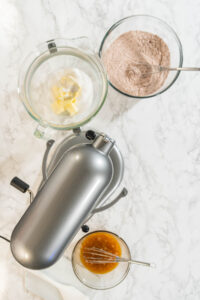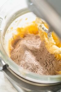 - In the bowl of your kitchen mixer, add the room-temperature unsalted butter and granulated sugar. Using the paddle attachment, cream the butter and sugar together on medium speed for about 2-3 minutes, until the mixture becomes light and fluffy.