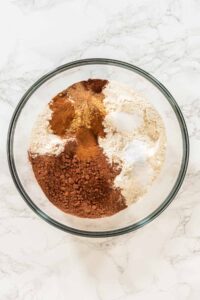 - In a large mixing bowl, combine the flour, cocoa powder, cinnamon, ginger, baking soda, cloves, nutmeg, and salt. Whisk the dry ingredients until fully combined and set aside.