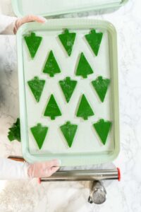 - Use your Christmas cookie cutters (or any preferred shape) to cut out cookies from the rolled dough. Carefully transfer the cut-out shapes onto the prepared baking sheet, leaving about 1 inch of space between each cookie.Before baking, place the cut-out cookies in the refrigerator for an additional 10 minutes to help them hold their shape while baking.