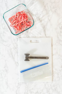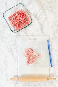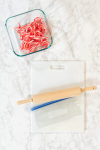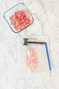 - Place the unwrapped candy canes in a gallon-size Ziploc bag and lay the bag flat on a sturdy cutting board.