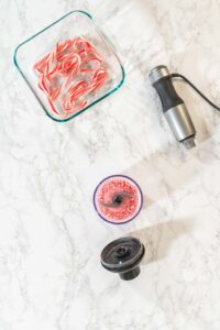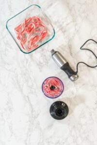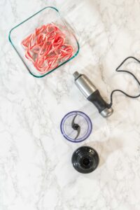 - Break the candy canes into 2-3 pieces and place them into a small food processor.