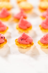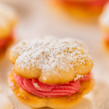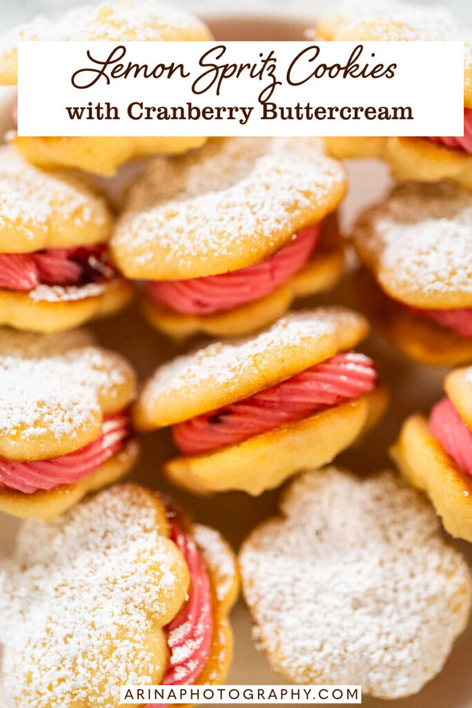 These lemon spritz cookies look elegant and festive when sandwiched with the pretty pink cranberry buttercream. Plus, they hold their shape really well when baked—no spreading or puffing, which makes them perfect for layering into cookie gift boxes. And if you love citrusy desserts, be sure to check out my Lemon Blueberry Bundt Cake and Lemon Spritz Cookies with Cranberry Buttercream video tutorial on YouTube!