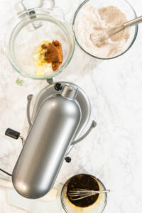 - Scrape the butter mixture from the sides of the bowl using a silicone spatula, then add the egg and maple molasses mixture. Mix on medium speed until fully combined.