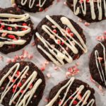 Using the saucier spoon, drizzle each chocolate cookie with white chocolate.
