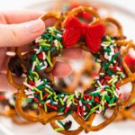 Once set, carefully remove the chocolate pretzel wreaths from the parchment paper.