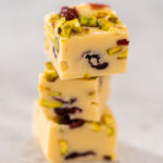 Fold the pistachios and cranberries into the fudge mixture with a silicone spatula.