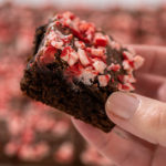 After removing the brownies from the oven, immediately sprinkle peppermint chips on top and lightly press them once with a silicone spatula. Be careful not to press too many times to avoid melting the chocolate chips and turning them into a peppermint spread.