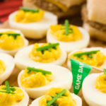 Finally, arrange the chives on top of each deviled egg to look like football lacing. Serve and enjoy!