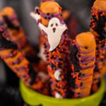 Drizzle purple chocolate over the orange pretzel rods and add chocolate ghosts, bats, and sprinkles immediately before the chocolate hardens.