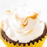 If the meringue frosting starts to flatten then just take a whisk and whip it by hand for 2- 3 minutes. Spoon the frosting onto the cooled cupcakes and use a cake spatula to create peaks and edges.To get that lovely toasted marshmallow effect, you can carefully use a kitchen torch to toast and brown the peaks and edges.