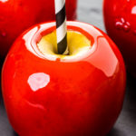 Finally, carefully dip each apple into the red syrup one at a time. Swirl the pan around from one side to the other to thoroughly coat each apple with the candy mixture, and then carefully transfer the candied apple to a sheet of parchment paper to cool and harden completely.Before serving, cover each of the bamboo skewers with a Halloween-themed paper straw.Candied apples are usually ready to eat in about 10 minutes.