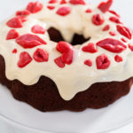 Finally, finish this Valentine's bundt cake by gently sticking the chocolates into the cream cheese frosting over the entire bundt cake. Serve and enjoy!Remember to use disposable gloves whenever handling homemade chocolates so they don’t melt.I like to store my bundt cakes in tall wilton plastic containers.