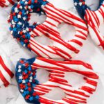 Immediately after dipping each pretzel, cover the blue chocolate side with sprinkles before it has time to dry.