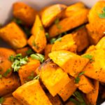 Repeat this process until all sweet potatoes are cubed and place the cubes in the large mixing bowl.