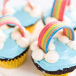 Pipe clouds with a white buttercream frosting. Insert sweet and sour rainbow candy into the clouds.